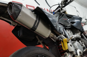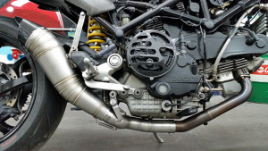 - Ducati S2R 1000 con escape tipo pork legAdaptación de escapes modificando la posición original, con esto conseguimos que se vea bien el monobrazo.
