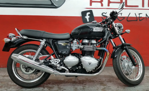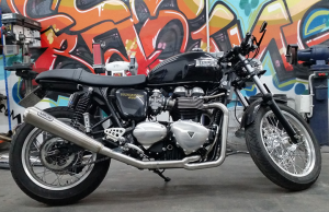 - Modificación de escapes para Triumph ThruxtonEn esta Triumph hemos cambiado la inclinación de los escapes, para que el cliente tuviera suficiente espacio para poner las alforjas.