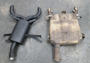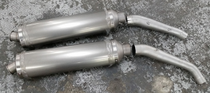 - Reparación de escape AkrapovicEstos escapes de RSV 1000R estaban destrozados y abollados, en DCC RACING le hemos puesto unas fundas nuevas y le hemos sacado los bollos a los colectores que empalman con el escape.