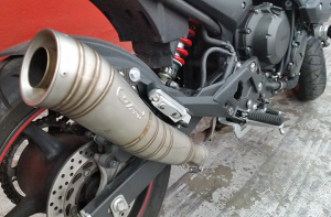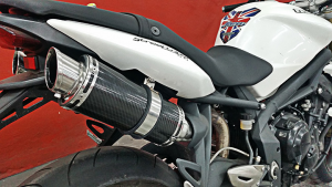 - Adaptación para una Triumph Street Triple con doble salidaAdaptación de escapes en acero inoxidable y carbono con db killer con una salida por cada lado.