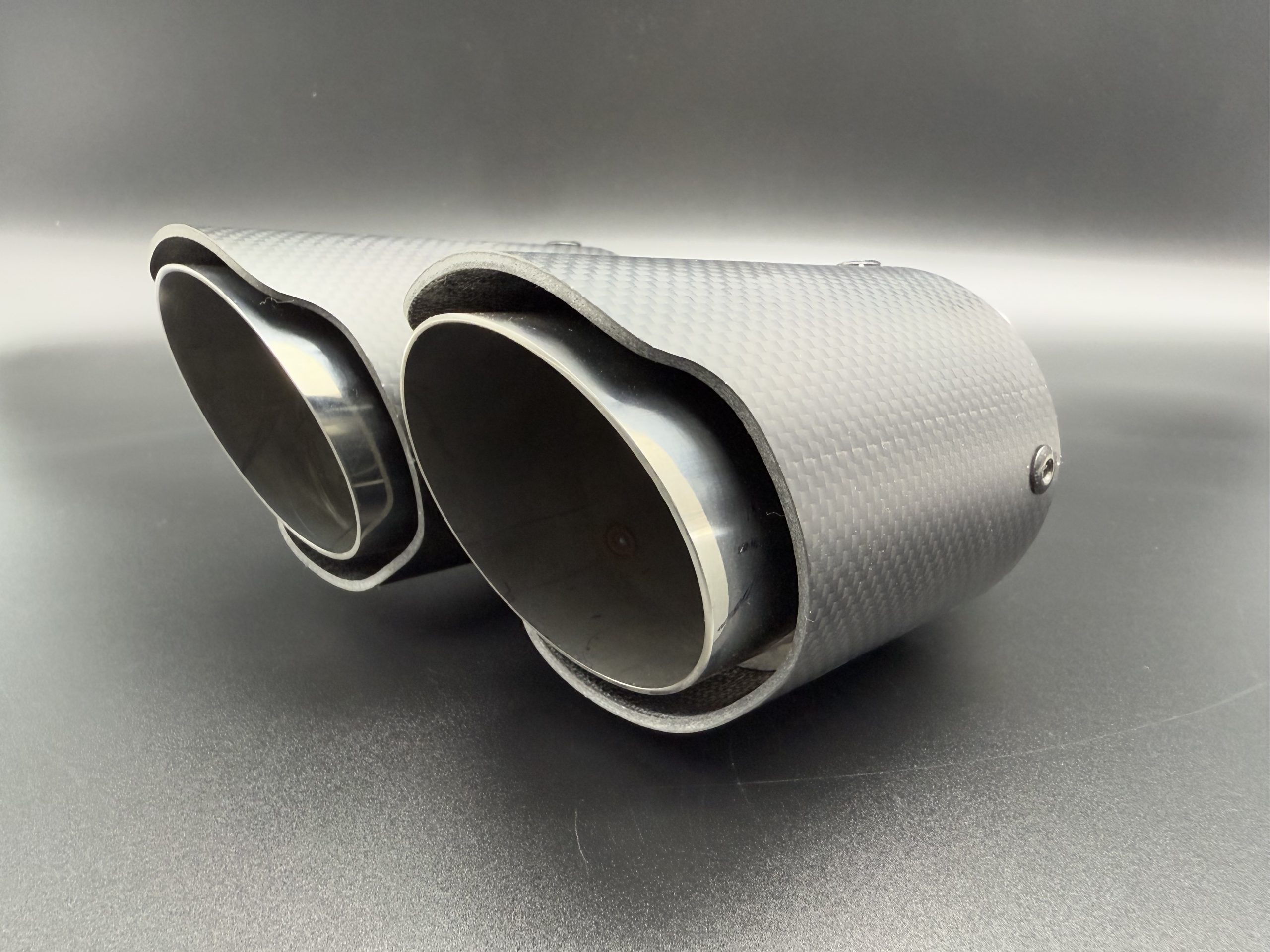 Cola de escape en acero inoxidable 304 con fundas de carbono, con diseño racing, entrada de 55 mm, salida de 80 mm y longitud total de 235 mm. Modelo para el lado derecho. Acabado deportivo y elegante.