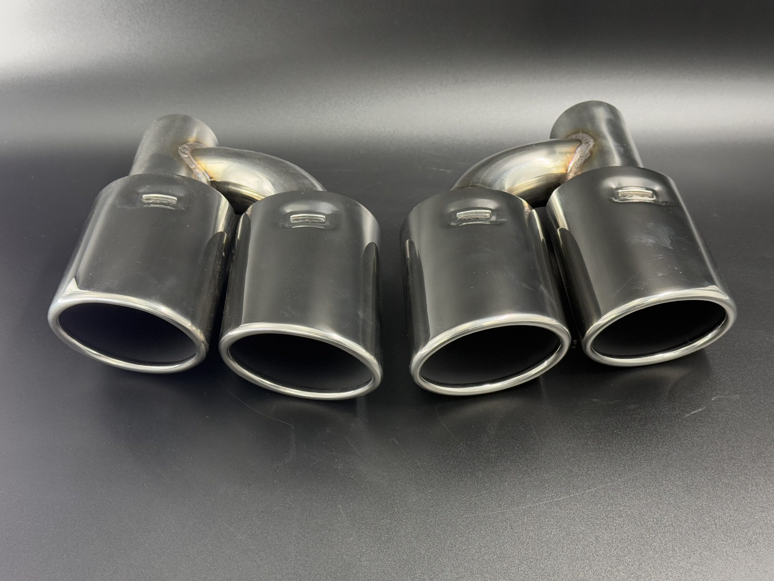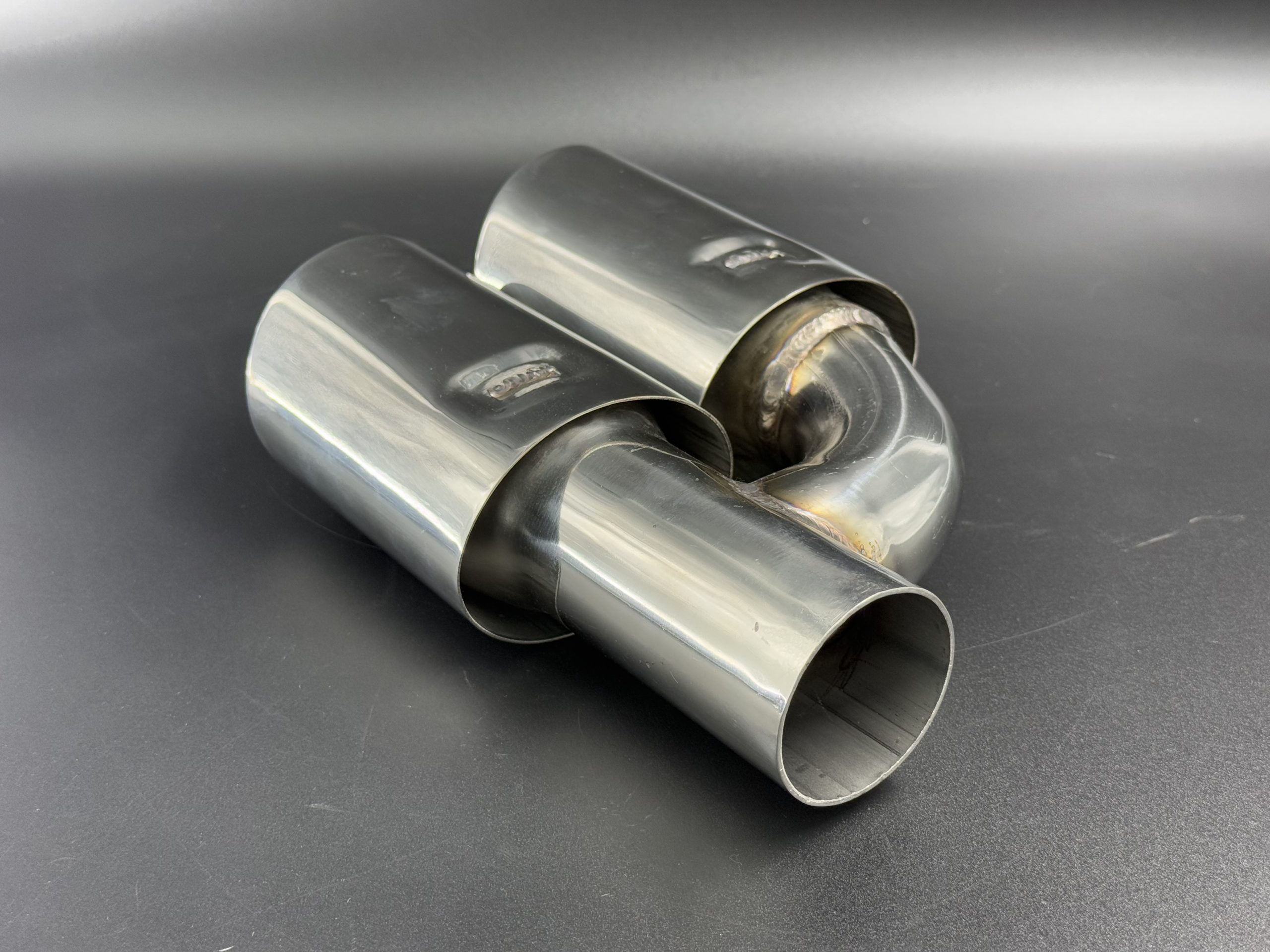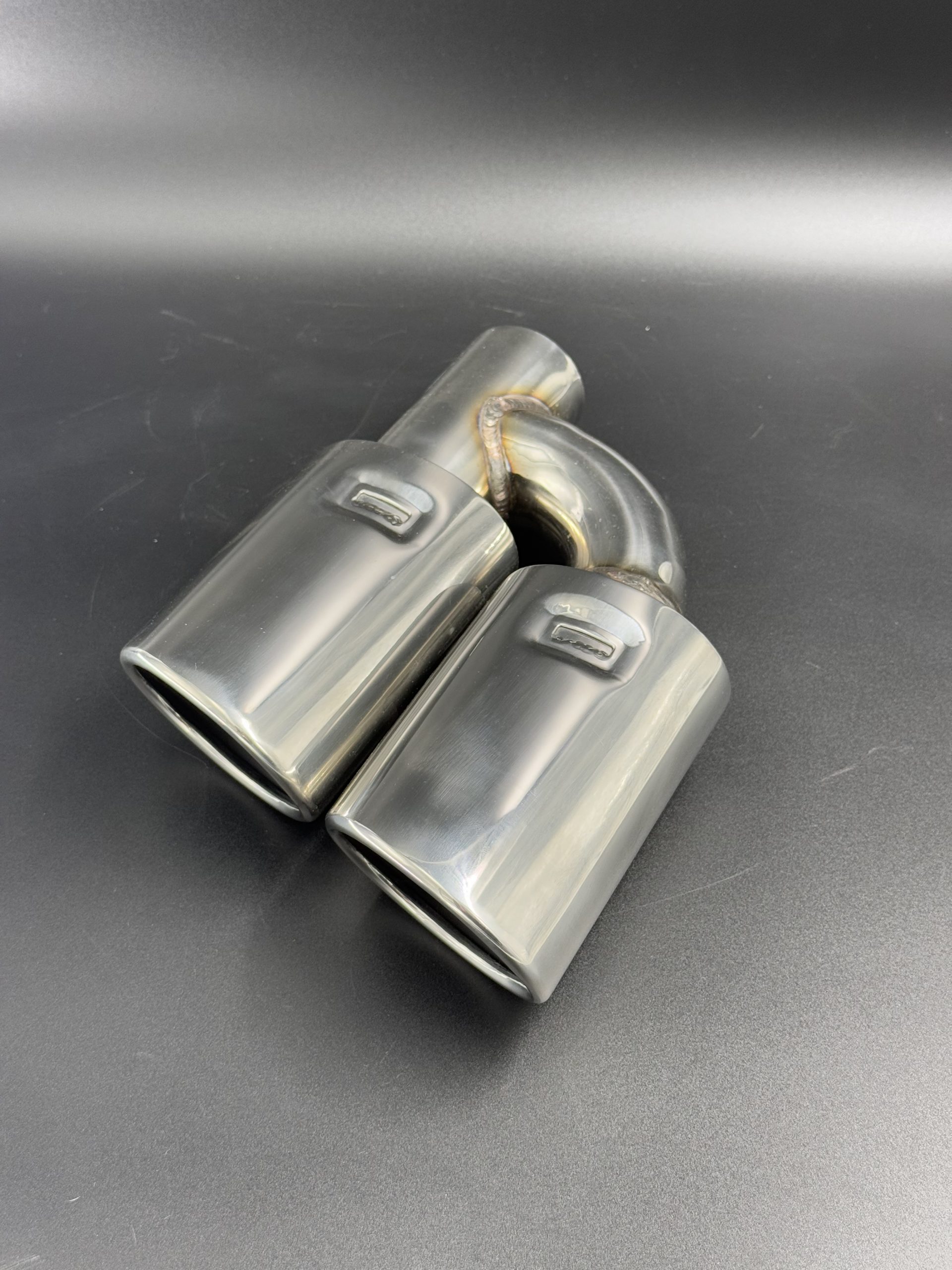 Cola de escape doble ovalada en acero inoxidable 304, con entrada descentrada de 54 mm y doble salida ovalada. Diseño deportivo y moderno para personalizar sistemas de escape.