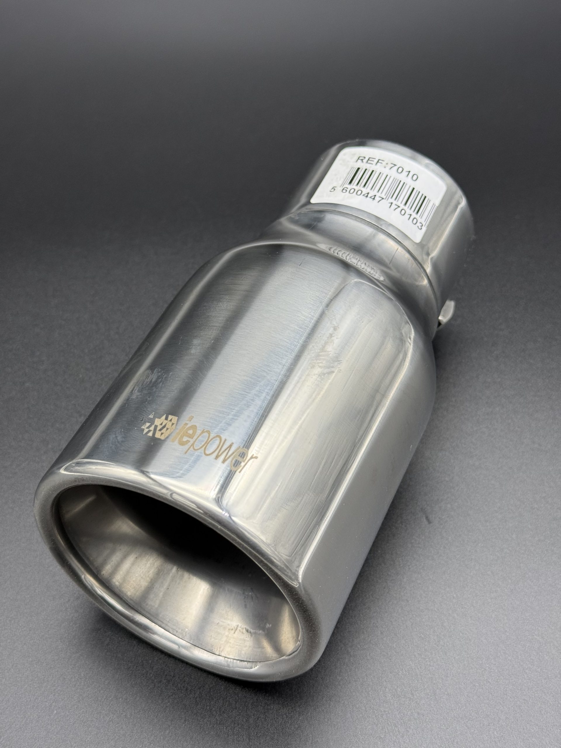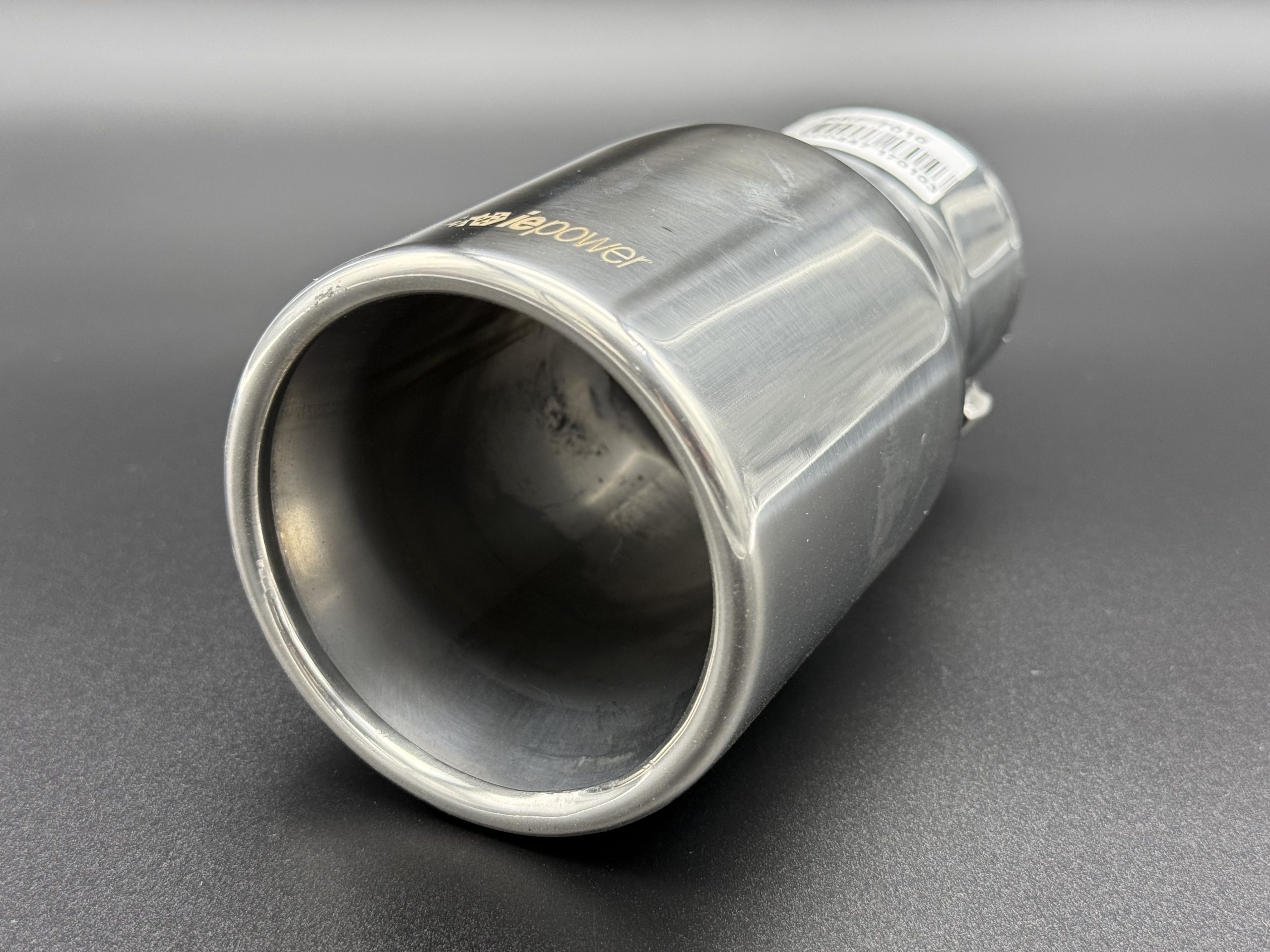Cola de escape universal en acero inoxidable 304 pulido, con entrada de 60 mm, salida de 90 mm y longitud de 160 mm. Diseño con acabado recto, elegante y deportivo.
