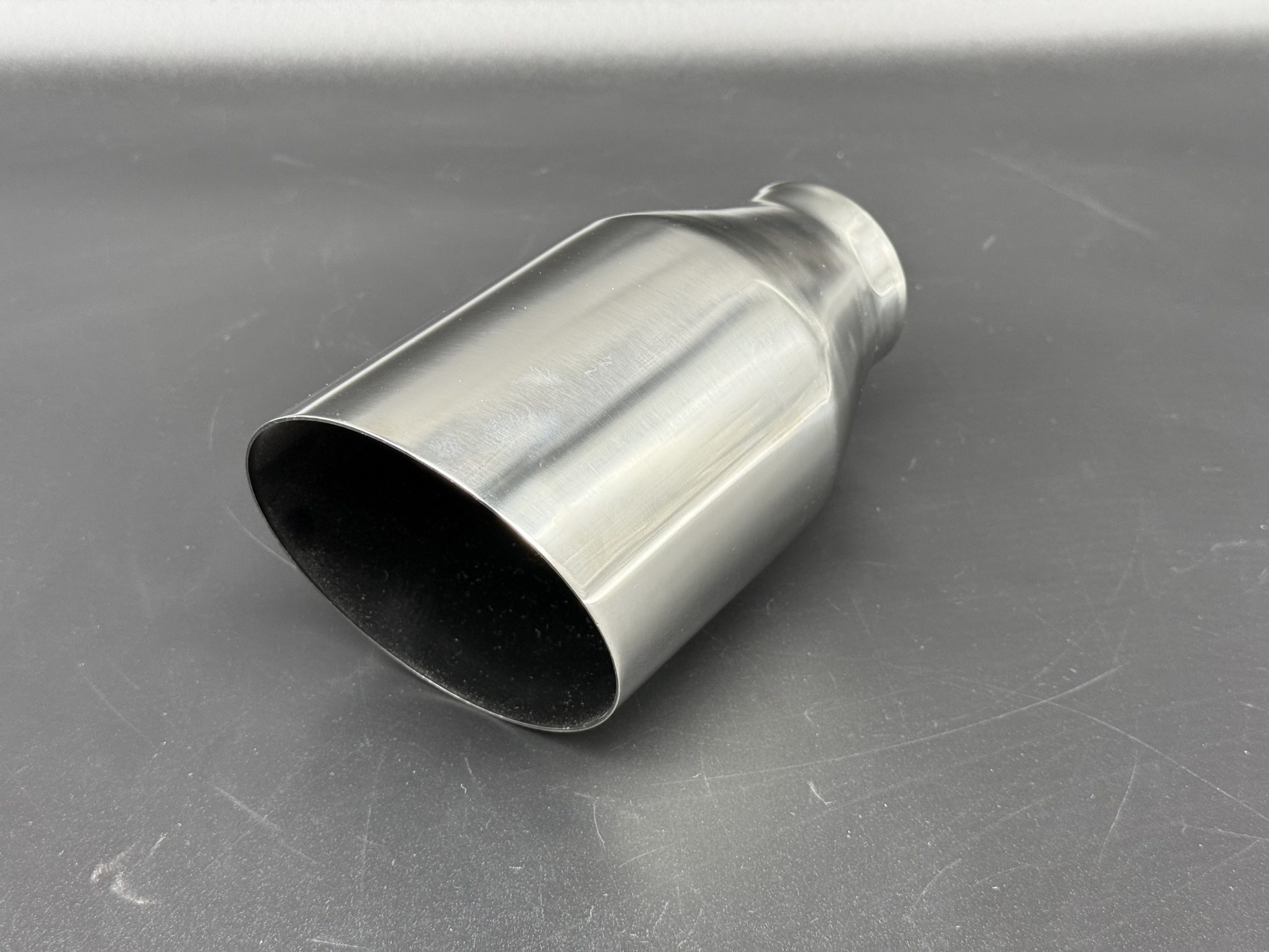 Cola de escape redonda en acero inoxidable 304, con entrada de 60 mm y salida de 101 mm. Diseño deportivo y moderno para sistemas personalizados.