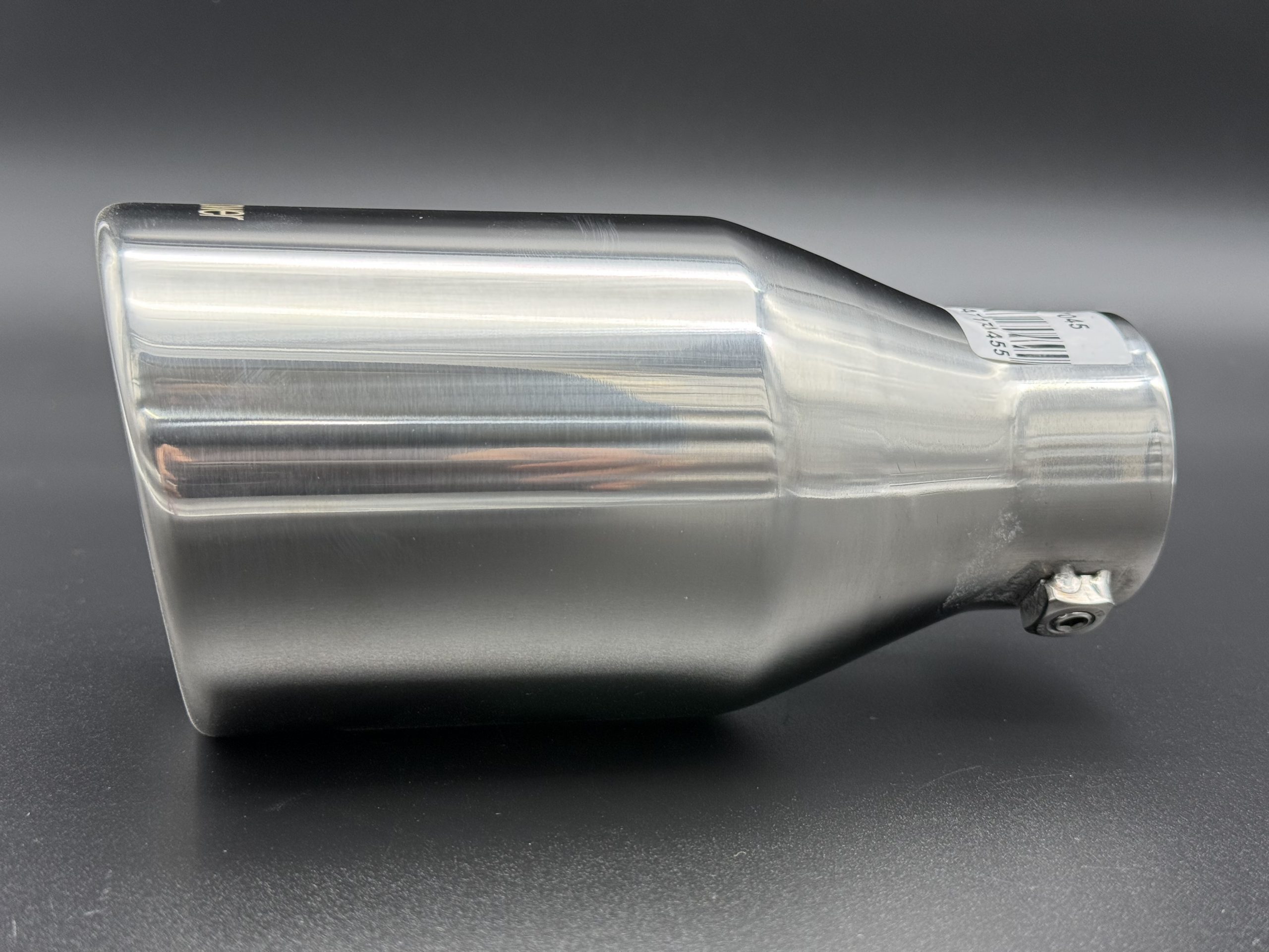 Cola de escape en acero inoxidable 304 pulido, con diseño oblicuo, entrada de 52 mm, salida de 90 mm y longitud total de 175 mm. Acabado deportivo y elegante.