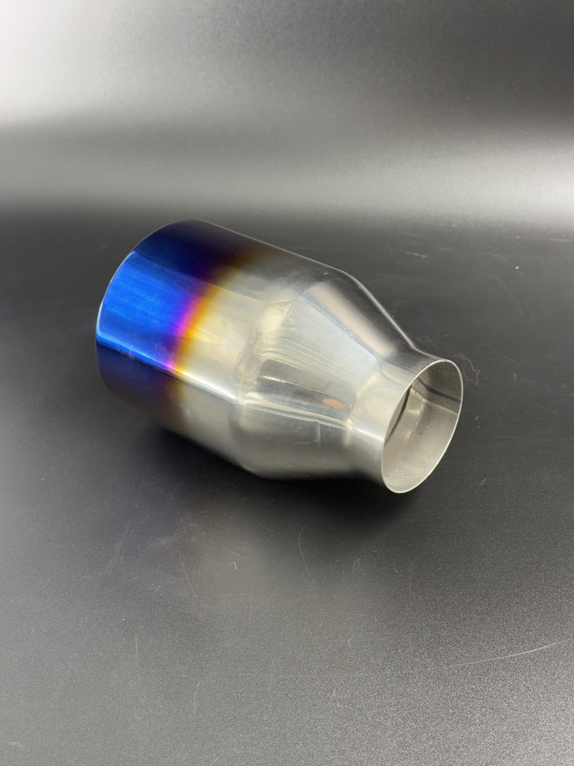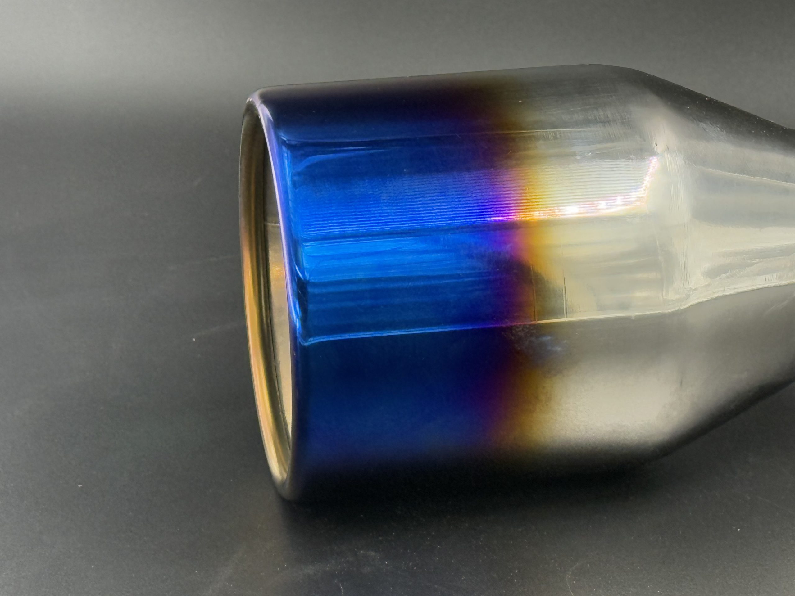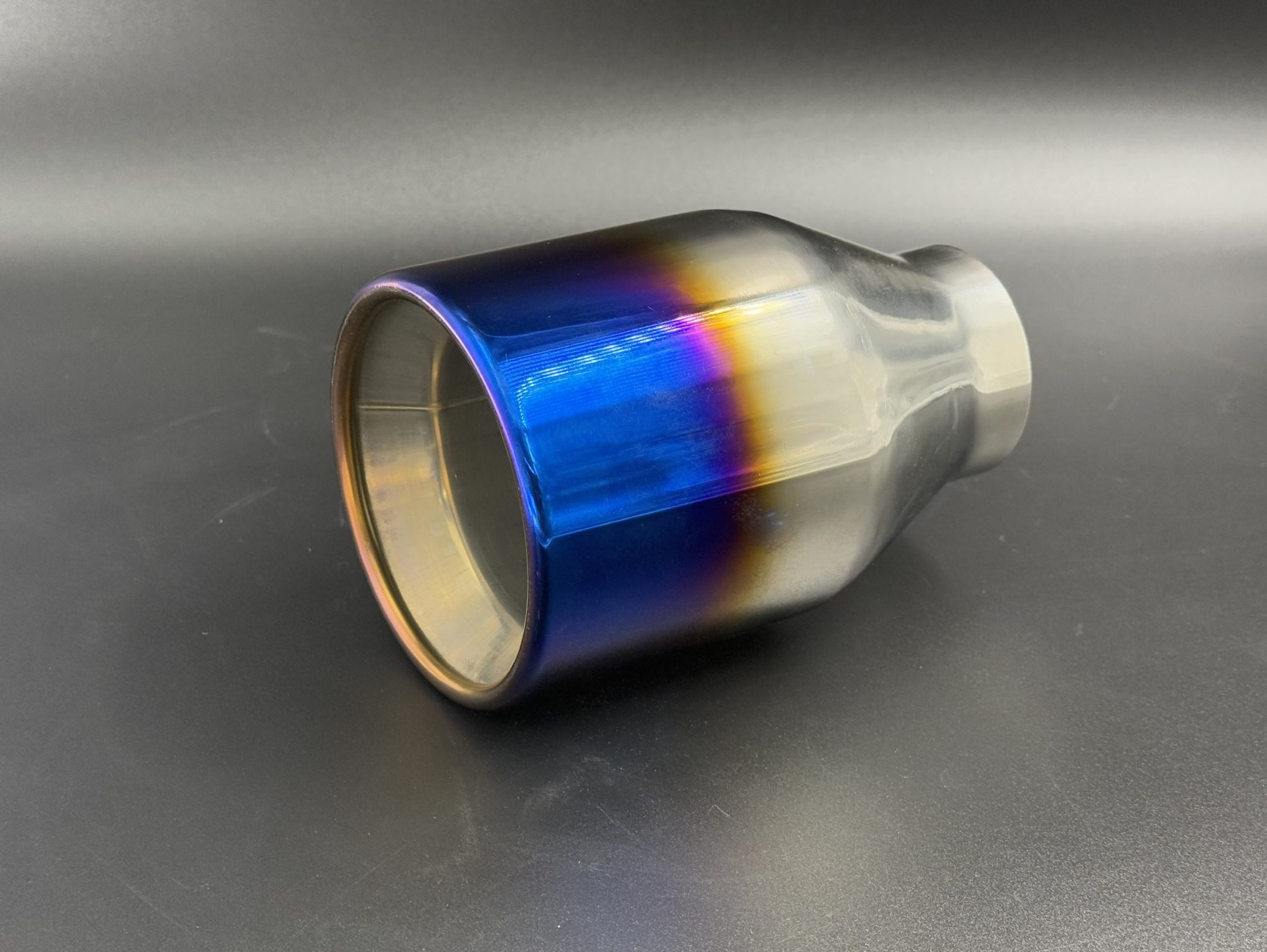 Cola de escape redonda en acero inoxidable 304 con acabado azulado, con entrada de 60 mm y salida de 101 mm. Estilo deportivo y moderno para sistemas personalizados.