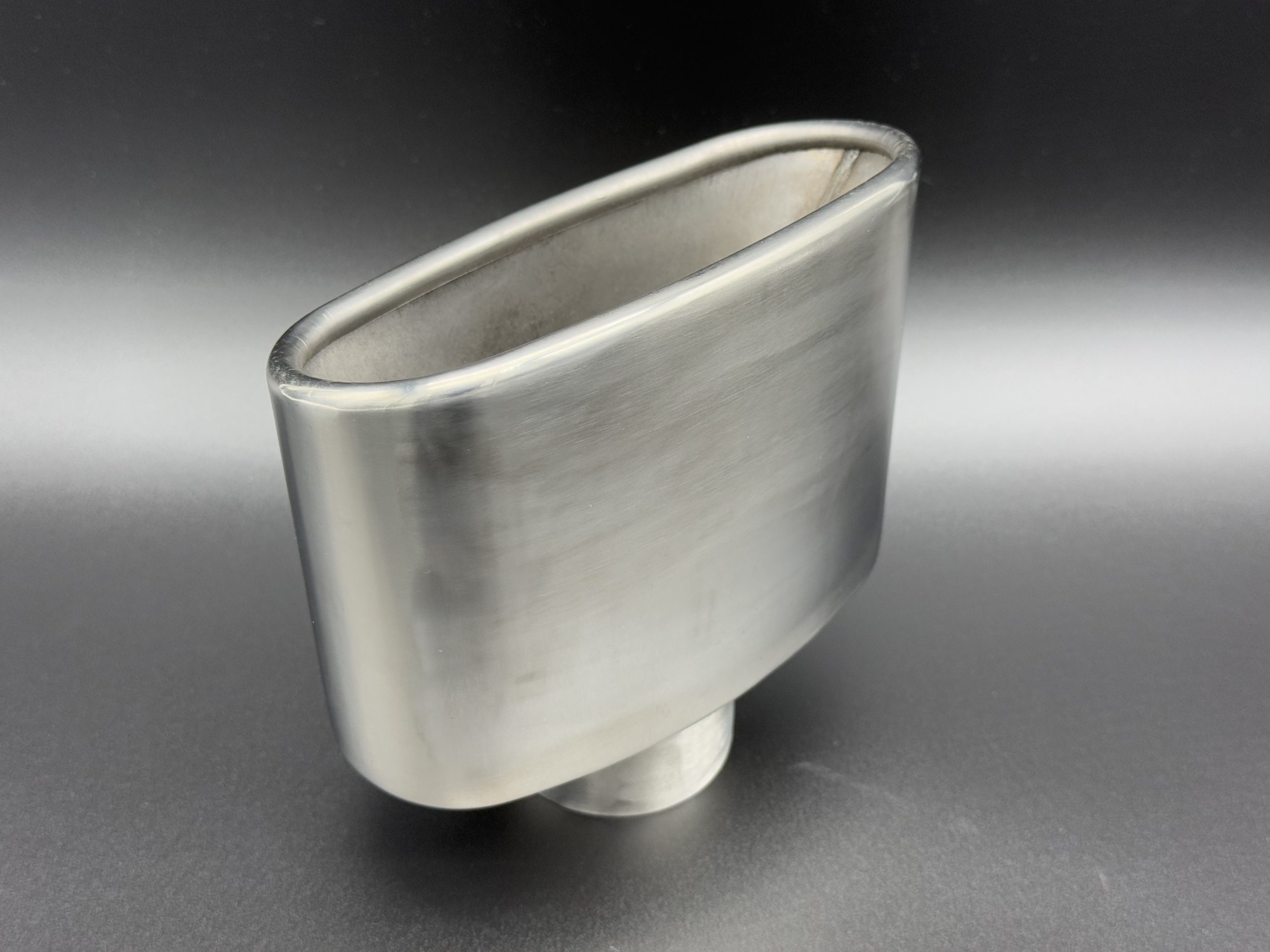 Cola de escape ovalada en acero inoxidable 304, con entrada de 54 mm, dimensiones 74 x 150 mm. Diseño moderno y deportivo para sistemas de escape personalizados.