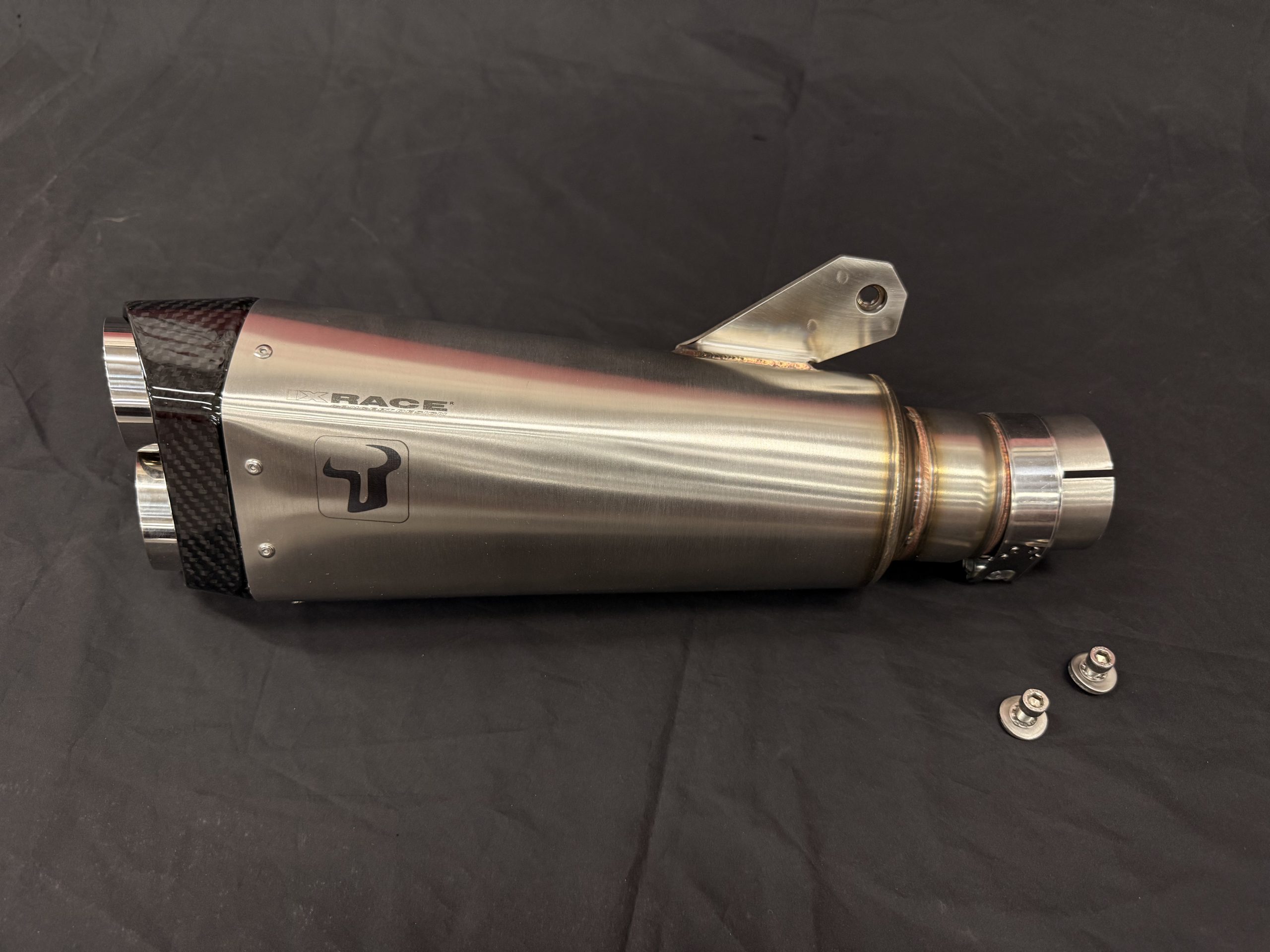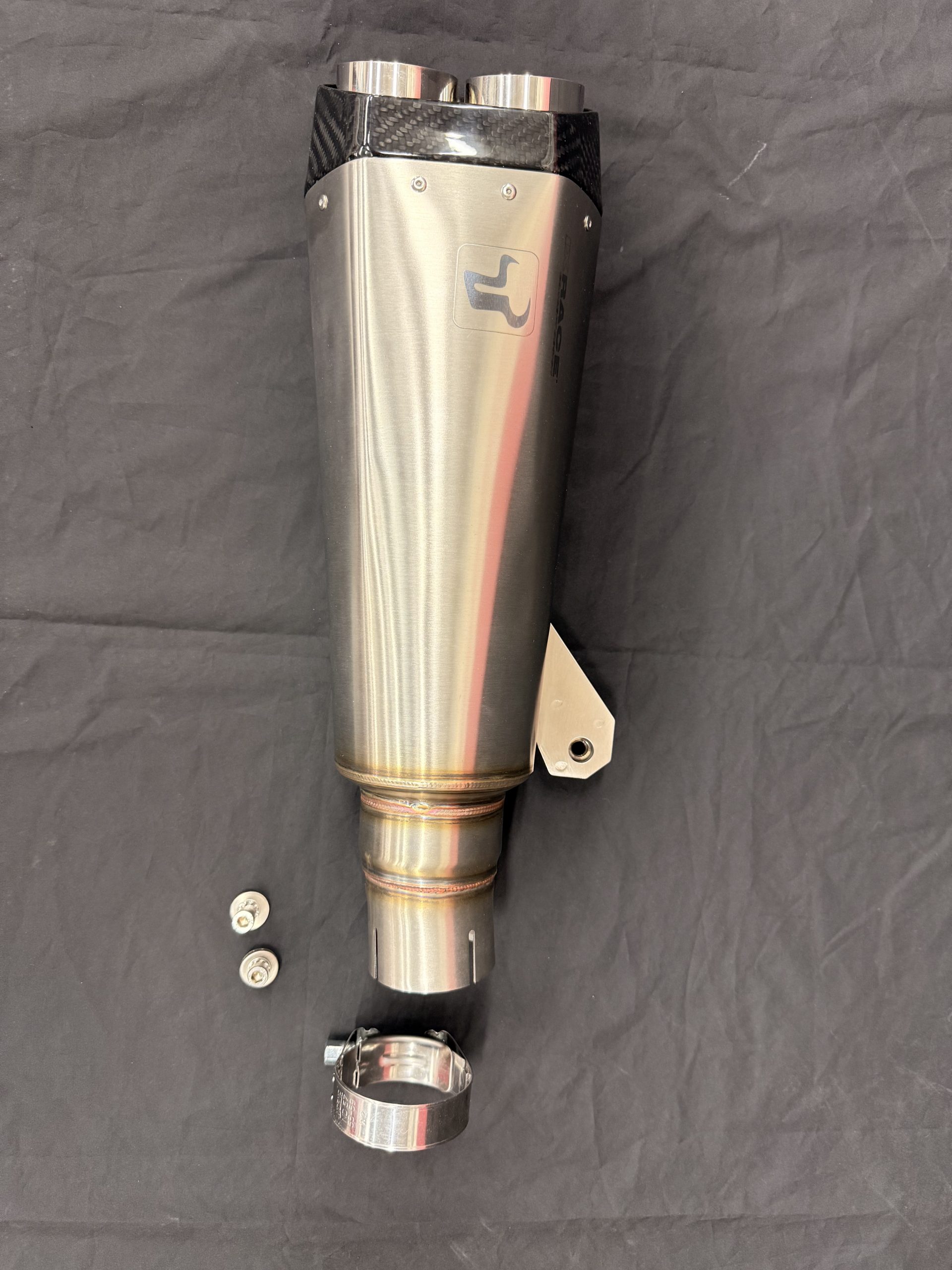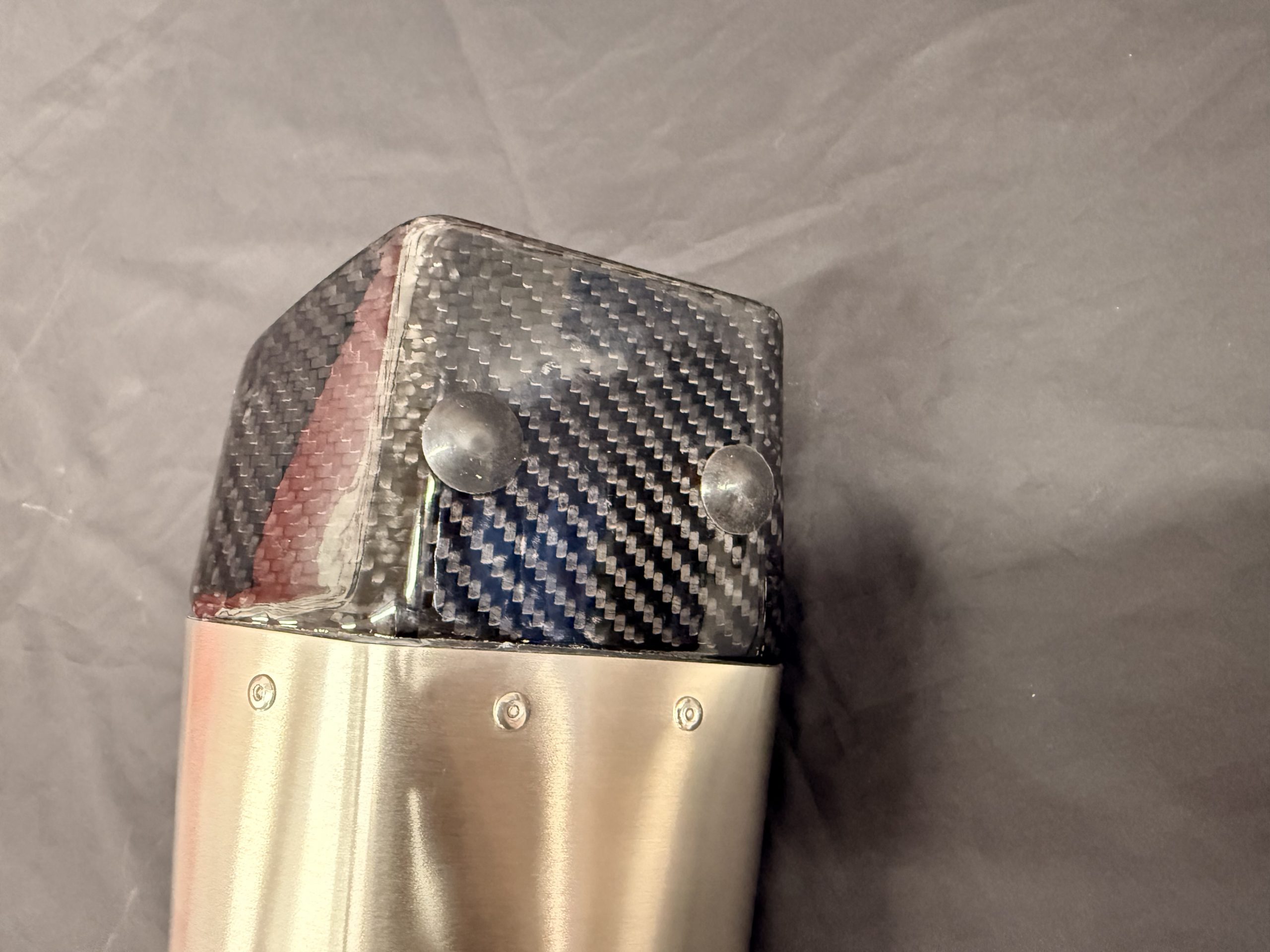 Incorpora terminales en fibra de carbono, que aportan un toque racing y una estética muy cuidada. El sonido es más profundo y contundente que el escape de serie, manteniendo un equilibrio entre deportividad y uso diario cuando se monta con dB-killer.