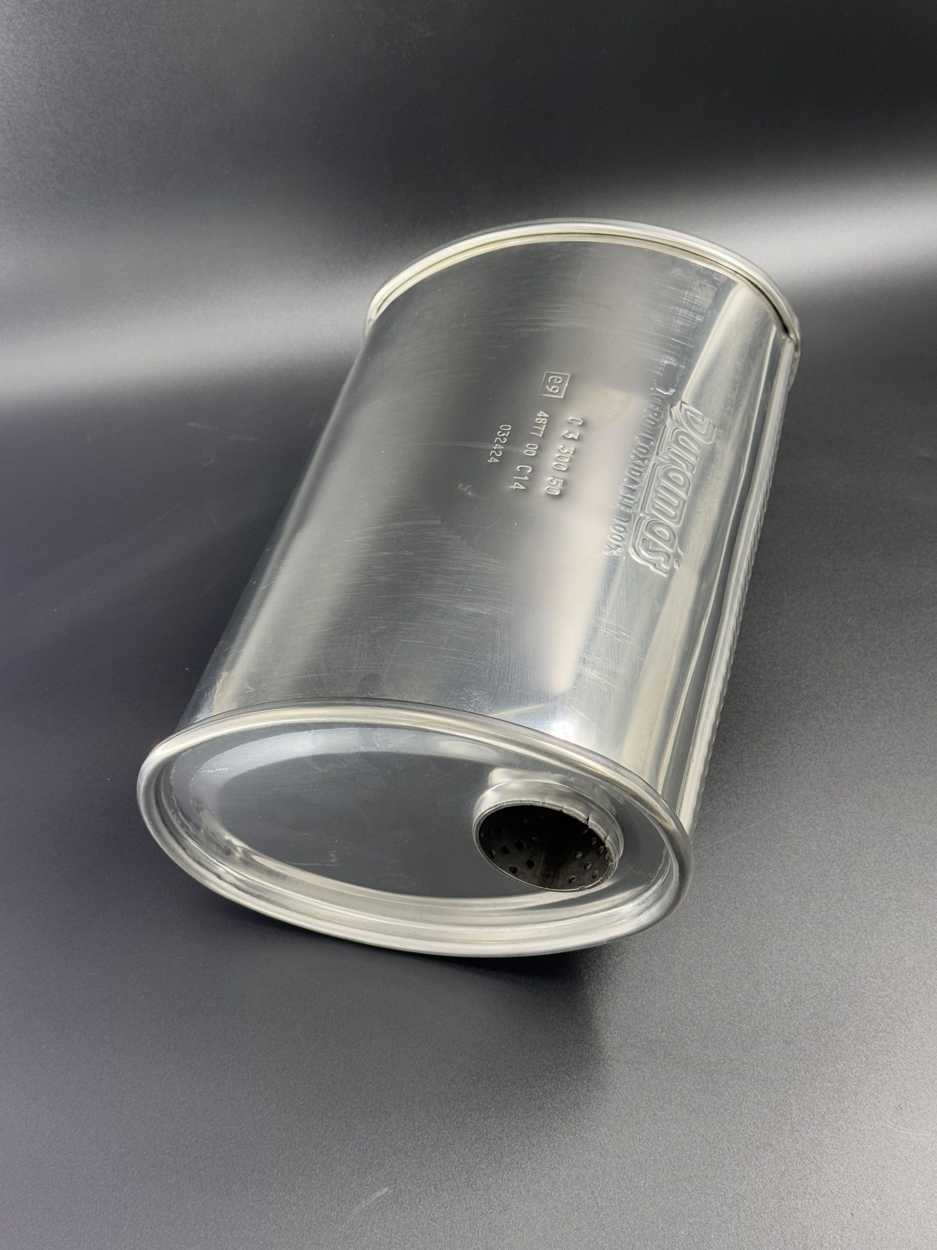 Escape Duramás INX C 3 350 en acero inoxidable con homologación, entrada y salida de 50 mm. Medidas: 350L x 130Al x 200An. Diseño equilibrado y funcional. Verifica la homologación para tu vehículo. Si tienes dudas, consúltanos.