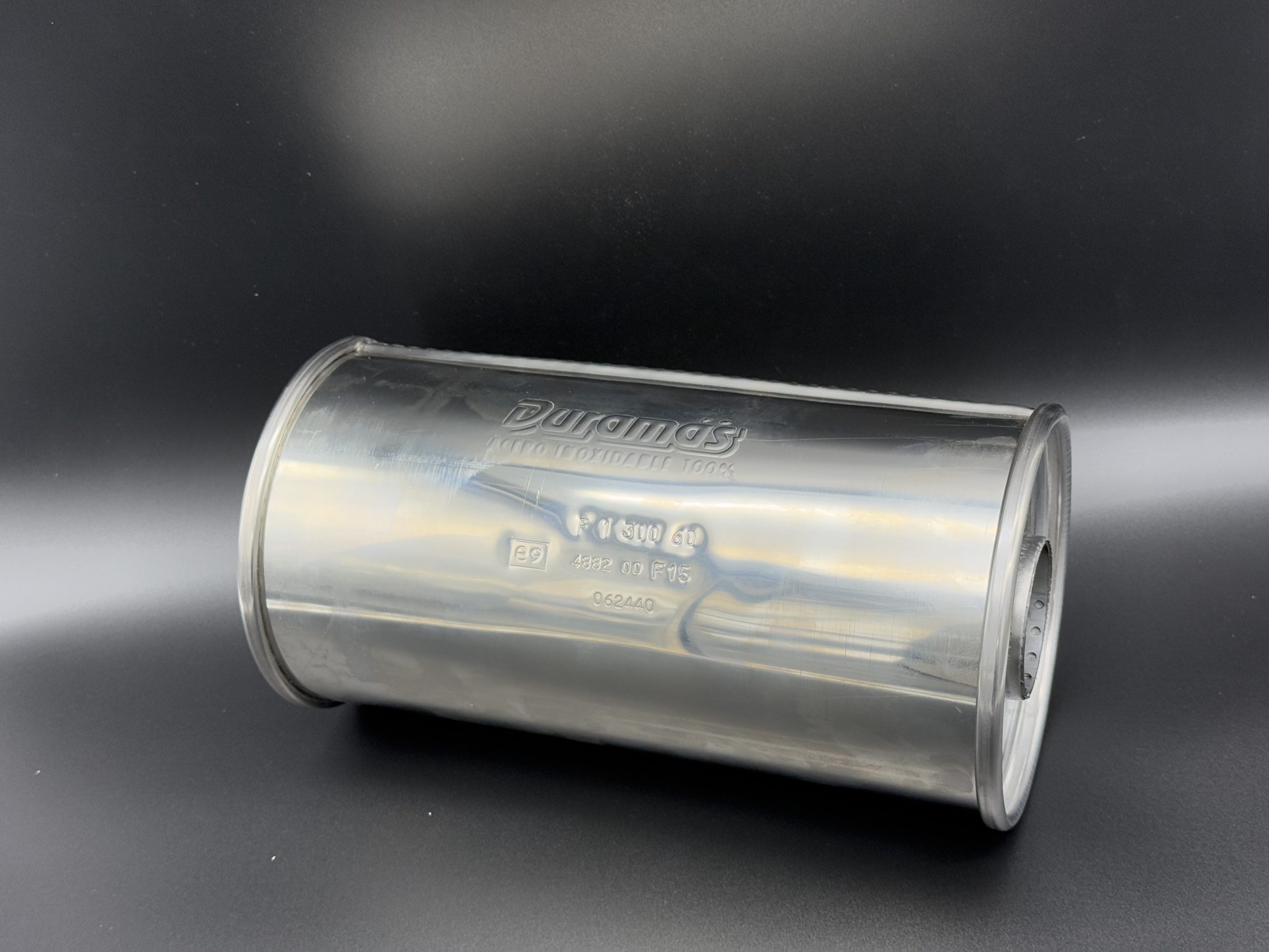 Escape Duramás INX F 1 300 en acero inoxidable con homologación, entrada y salida de 60 mm. Medidas: 300L x 150Al x 150An. Diseño compacto y eficiente.