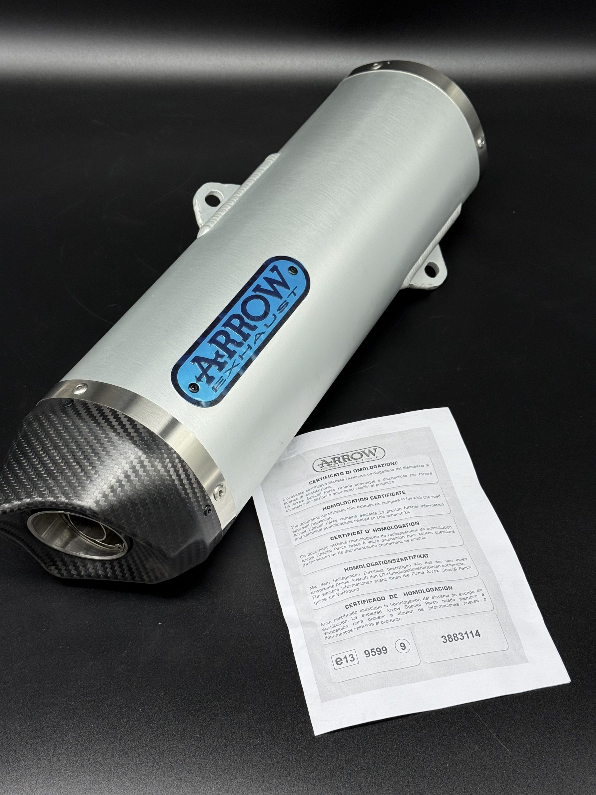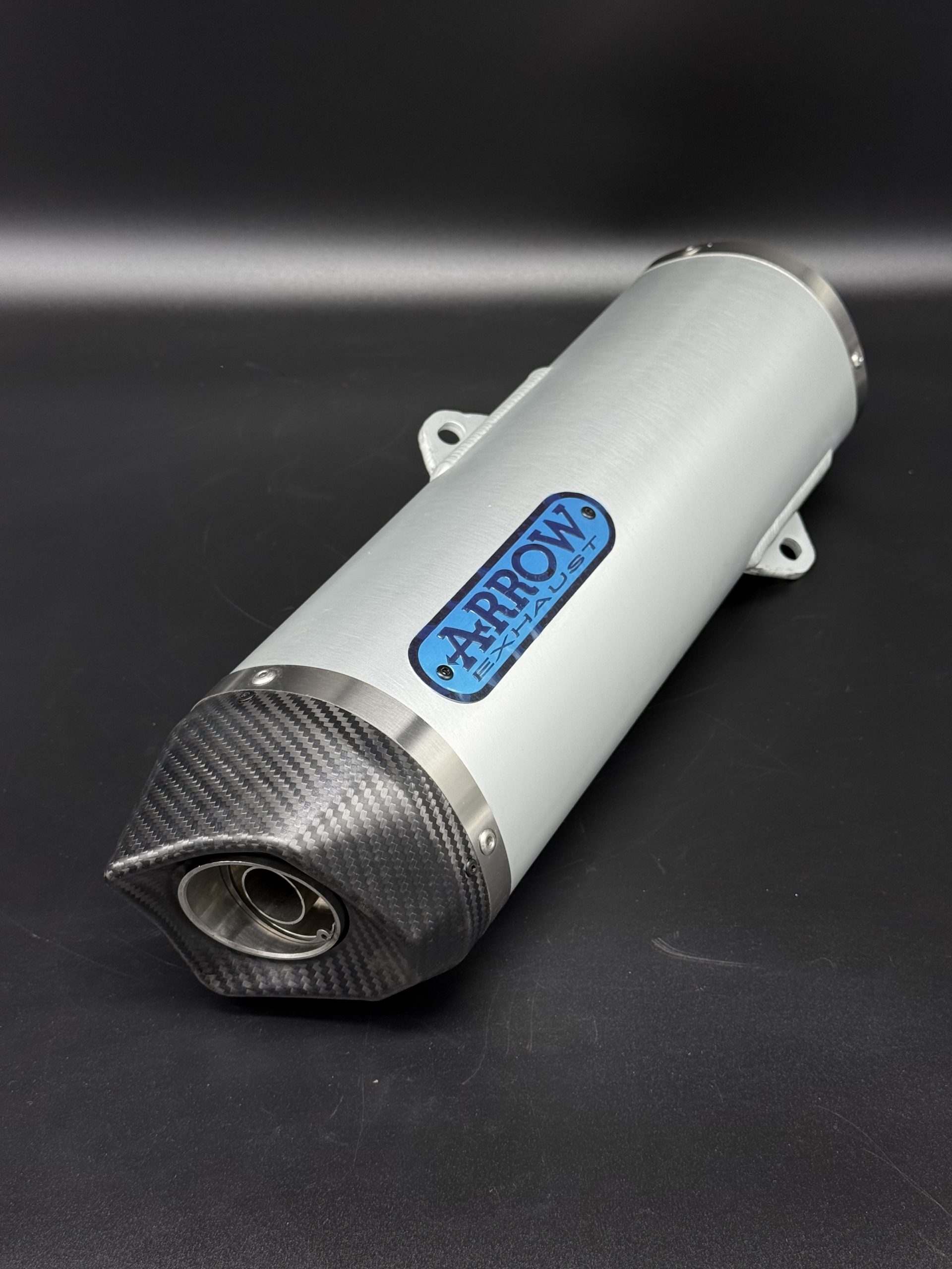 Escape homologado Arrow para Kymco Xciting 400, con exterior de aluminio e interior de acero inoxidable. No incluye colector, pero puede adaptarse con un coste adicional. Diseño deportivo y duradero.